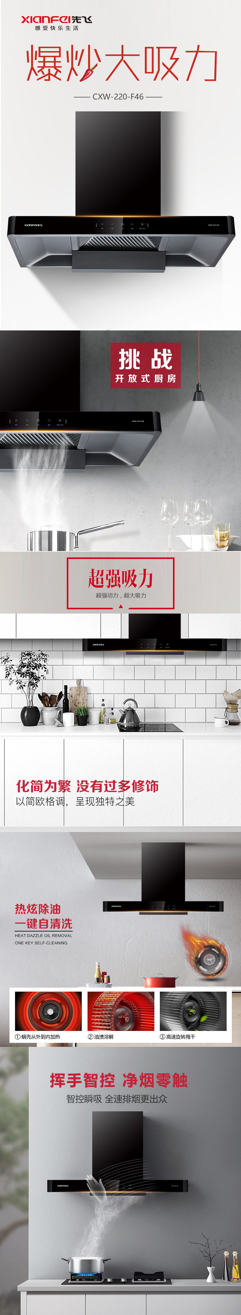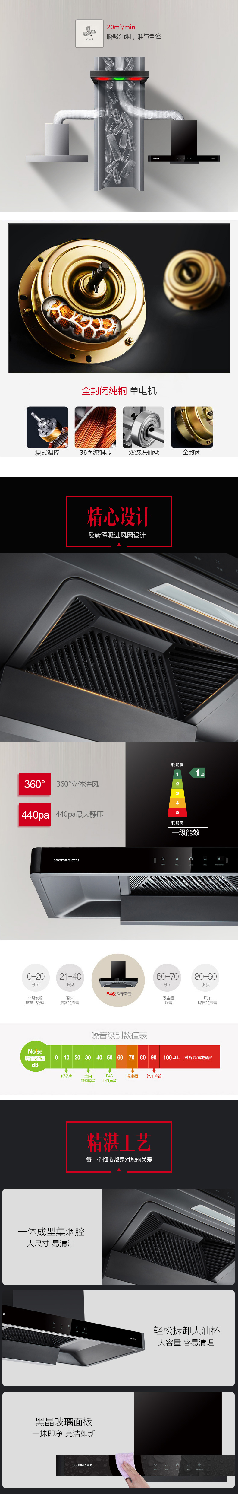 超強動力 超大吸力 以簡歐格調(diào) 呈現(xiàn)獨特之美 熱炫除油 一鍵自清洗 揮手智控 凈煙零觸 反轉(zhuǎn)深吸進風網(wǎng)設(shè)計 黑晶玻璃面板 一抹即靜 亮潔如新 360°立體進風 440pa最大靜壓