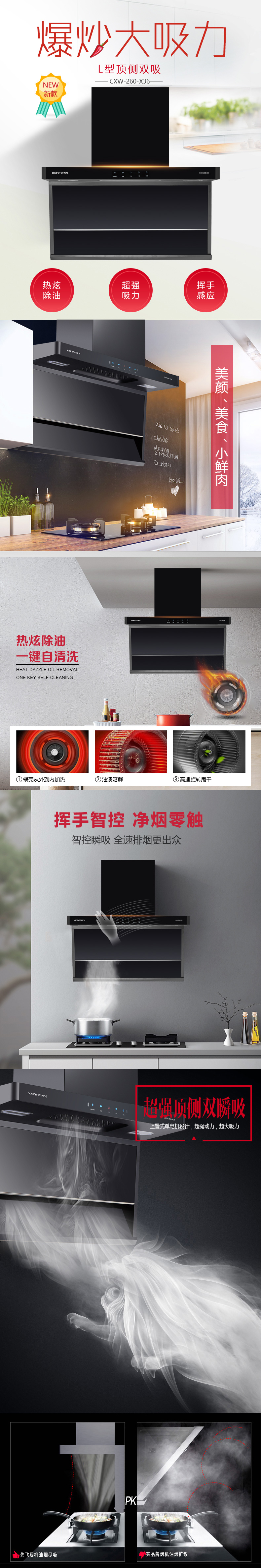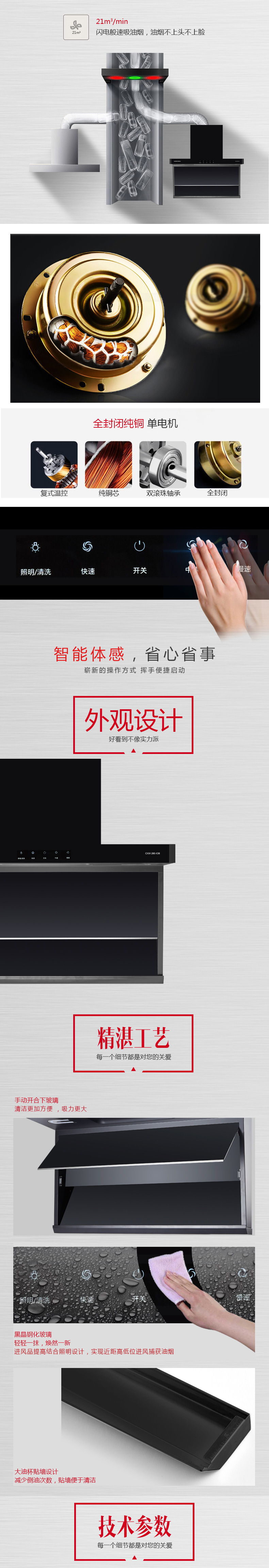 熱炫除油 一鍵自清洗 L型頂側(cè)雙吸 超強吸油動力 揮手智控 凈煙零觸 手動開合下玻璃 清潔更加方便 反轉(zhuǎn)深吸進風(fēng)網(wǎng)設(shè)計 黑晶玻璃 輕輕一抹 煥然一新 大油杯貼墻設(shè)計 閃電般速吸油煙 21m3/min