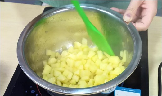 3.此時可以擠入小半個檸檬汁,翻炒蘋果粒待蘋果變軟、鍋內水分基本收干即可離火,放涼待用;(圖3)