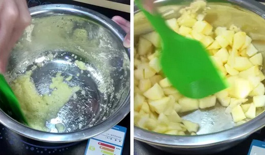 2.蘋果削皮去籽,切成小塊備用。鍋中黃油加熱充分融化(最好用不粘鍋),倒入砂糖攪拌至完全融化后倒入蘋果粒;(圖2)