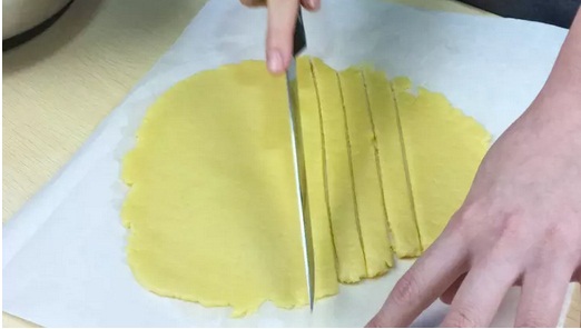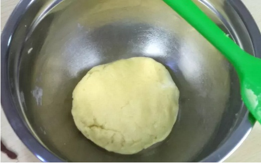 1.黃油室溫軟化,分別加入低筋面粉、全蛋液、水(牛奶),糖拌勻,用手抓成面團,用保鮮膜包好冷藏松弛30分鐘。(圖1)