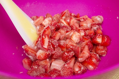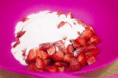 4.切好的草莓丁放入一只干凈的大碗中,加入細砂糖;(圖4)