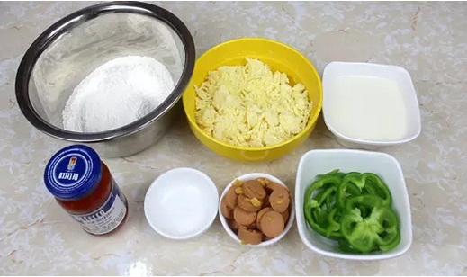低筋面粉——200g、酸奶——200g、泡打粉——2茶勺、鹽——1/4茶勺、青椒——1只、香腸——1條、馬蘇里拉芝士——適量、披薩醬——適量