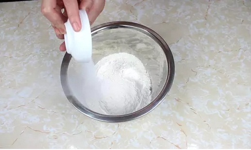 1.披薩烤盤上提前撒上干面粉抖勻后倒掉多余的面粉,將鹽和泡打粉加入面粉中拌勻;(圖1)