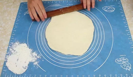 5.面板上撒少許面粉,把面團搟成與適合烤盤大小的面餅即可;(圖5)