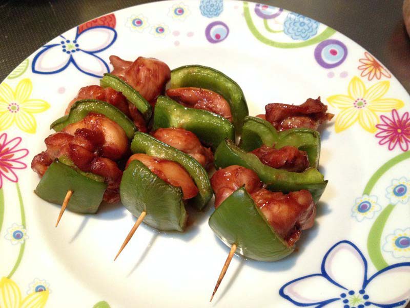 和青椒(或是彩椒、菌菇)相間著串起來,入烤箱200度15分鐘。中途刷一至兩遍蜂蜜。(附圖4)