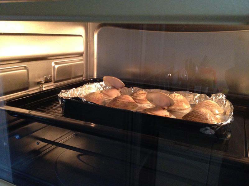 大青蛤,吐盡沙后刷一刷洗一洗,平鋪入烤箱,200度15分鐘。一個個在烤箱中慢慢打開(好殘忍!)(附圖2)海鮮本來就有少許咸味,吃口淡的不必加料碟,真正的原汁原味!