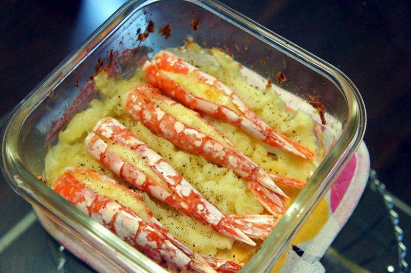 如果是對蝦、明蝦,開背,切到蝦腹不斷刀,嵌入芝士,下面鋪土豆泥,表面撒少許鹽入烤箱,200度20分鐘。出爐撒黑胡椒。直接用玻璃器皿烤,又不占鍋、不占盆,總之,一切變得很輕松……