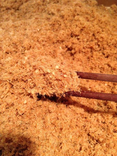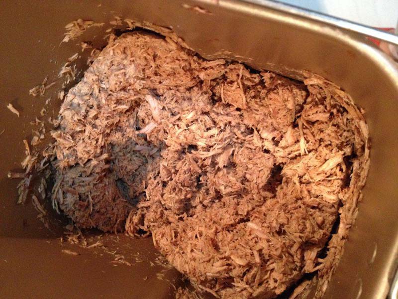 瀝掉湯汁,加入糖、油、芝麻、少許五香粉,入面包桶開啟和面檔,攪至肉纖維成為細(xì)絲,這個過程不是太長,約20分鐘。如果你的面包機有肉松或果醬程序,這時候就可以開啟果醬程序玩去了……如果沒有面包機,可以把肉放入保鮮袋,用搟面杖來回搓搟。(附圖10)