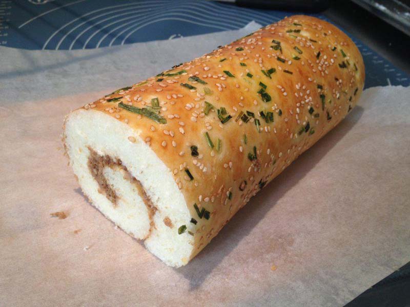 肉松不僅僅可以配粥吃,用它來做面包的配角也非常出彩。制作一個基礎(chǔ)面包面團,基礎(chǔ)發(fā)酵+排氣后,搟成方型餅狀,二次發(fā)酵到位后表面涂一層蛋液,撒蔥花和芝麻,150度20分鐘。烘烤時需要注意的是用低溫,表面烤至淺色就可以了,否則表層過硬,卷起時容易破裂。面包餅放涼后,翻轉(zhuǎn),涂一層色拉醬,撒上滿滿的肉松,卷起!好好味!(附圖13)