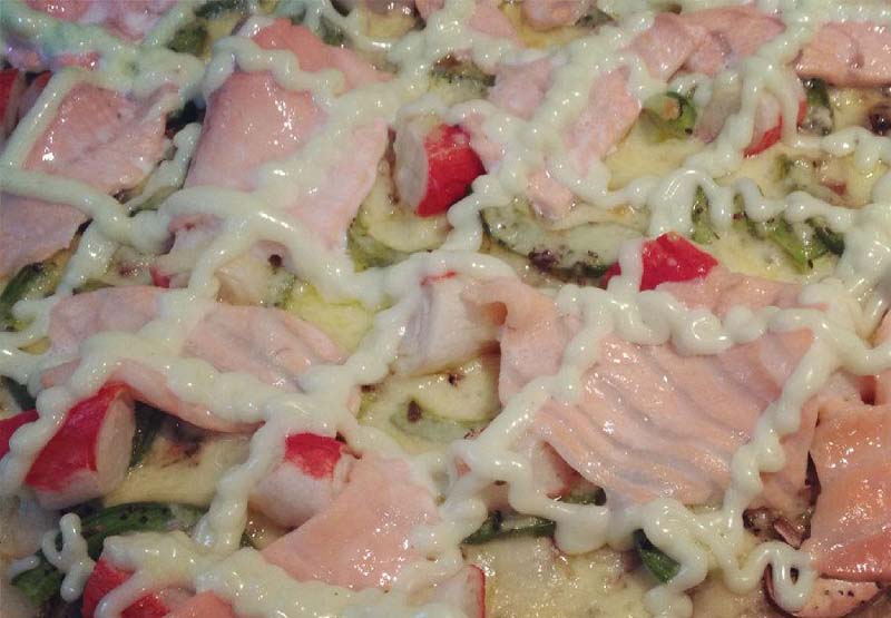 我最喜歡的披薩是多年前必勝客的大西洋珍鮭披薩,自己做也非常簡單,披薩餅的具體做法就不贅述了,和面包差不多,就是搟成薄餅狀。我就說一下這個披薩的配料,三文魚+(蟹肉棒、蝦仁、魷魚條等海鮮自行選擇)+青椒+蘑菇+馬蘇里拉芝士,三文魚與番茄醬不搭,所以這個披薩不放常規(guī)的番茄醬,而是自制一種與三文魚絕配的醬料(山葵醬或芥末醬+色拉醬,比例約是1:10)。三文魚待整個披薩烤熟后再平鋪在上面,回爐1分鐘,出爐擠上特制醬料。(附圖15)