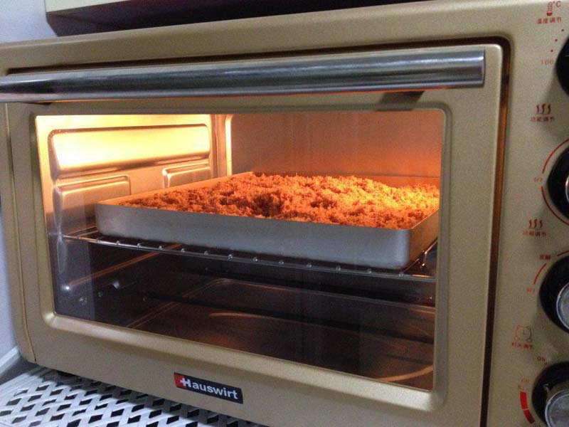 攪得差不多后入平鋪在烤盤上,入烤箱,低溫100-120度,開啟熱風(fēng)(一定要有熱風(fēng)功能的烤箱哦),進(jìn)行烘干。每過十幾分鐘翻拌一下。附圖11)