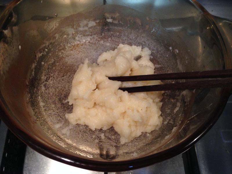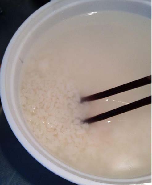準(zhǔn)備一盆涼水,一定要是礦泉水或是涼白開,不能用自來水。做酒釀全程的容器都要干凈,用開水燙過,無生水無油。把蒸好的糯米倒入涼水,攪開。一是降溫,二是打散米粒。(附圖46)