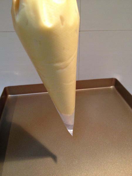 后面的步驟就和網(wǎng)上一樣了,待涼后分次加入蛋液,至面糊在筷子頭形成倒三角而不滴落的狀態(tài),裝入裱花袋,擠在烤盤上。(附圖19)