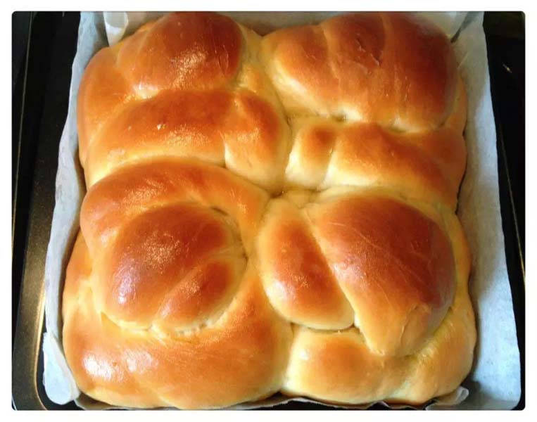 主面團:金像面包粉210克、低筋面粉90克、細(xì)砂糖96克、鹽1+1/2小匙、奶粉24克、蛋90克、水54克、黃油72克、表面裝飾:融化的黃油