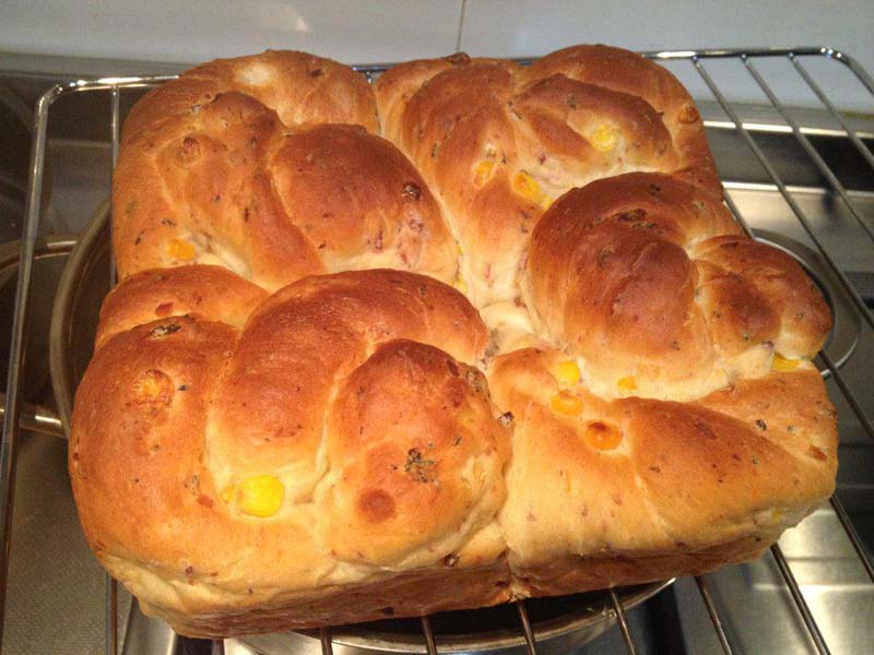 當(dāng)原味面包都吃膩了以后,除了在面團里加干果葡萄干,也可以嘗試著做成咸味面包,加煎過的培根和過水后瀝干的玉米。(附圖29)
