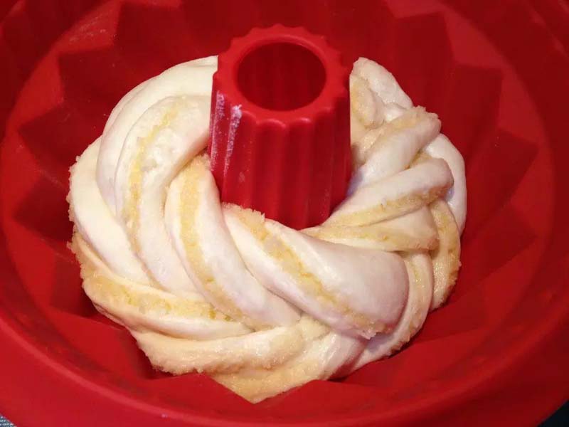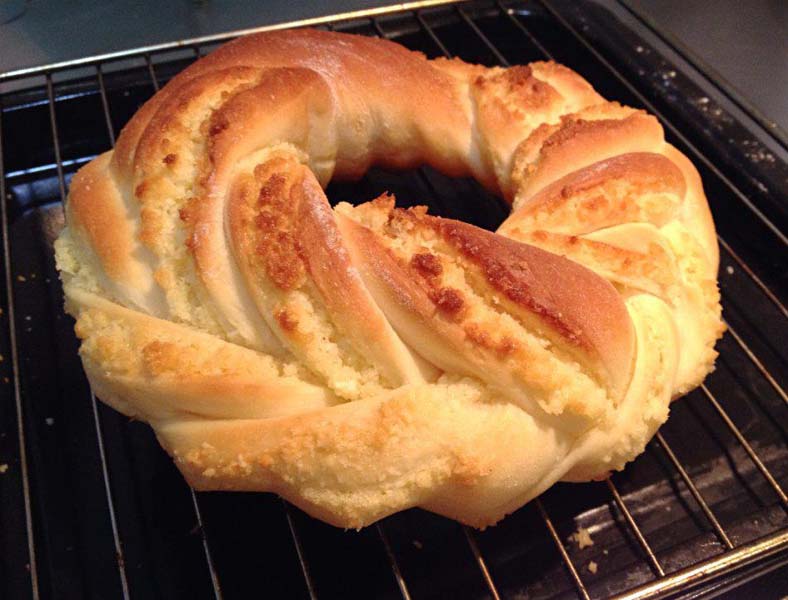 6、將相接的部分塞進(jìn)圓圈里,表面是5個辮,排到涂過油的烤盤上,放溫暖濕潤處進(jìn)行最后發(fā)酵。