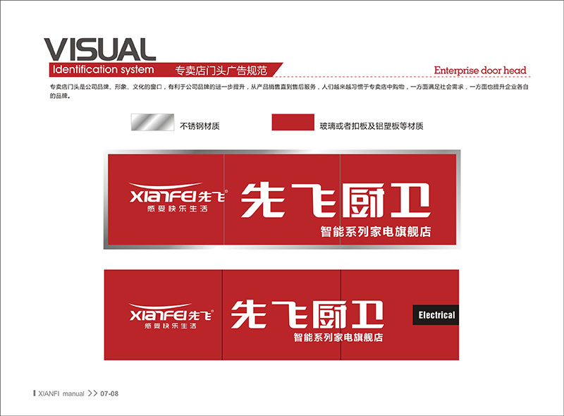 4、節(jié)約化的原則:VI設(shè)計(jì)是要使用的,故我們既需要考慮品牌傳播的效果,也需要考慮使用者的便利與成本。比如同一種材質(zhì)的門頭制作,如果經(jīng)銷商按照先飛VI系統(tǒng)設(shè)計(jì)要求則成本有較大幅度的增漲,那么VI設(shè)計(jì)就是失敗的。設(shè)計(jì)需要考慮使用,反對為了設(shè)計(jì)而設(shè)計(jì)。
