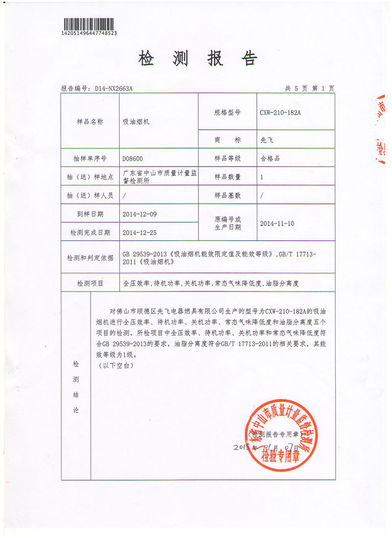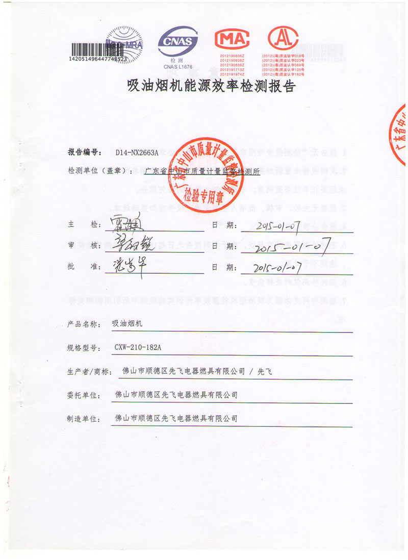 在2015年先飛廚衛(wèi)長沙經(jīng)銷商年會上,先飛公司再爆喜訊:先飛吸油煙機一次性率先通過國家一級能效認證!