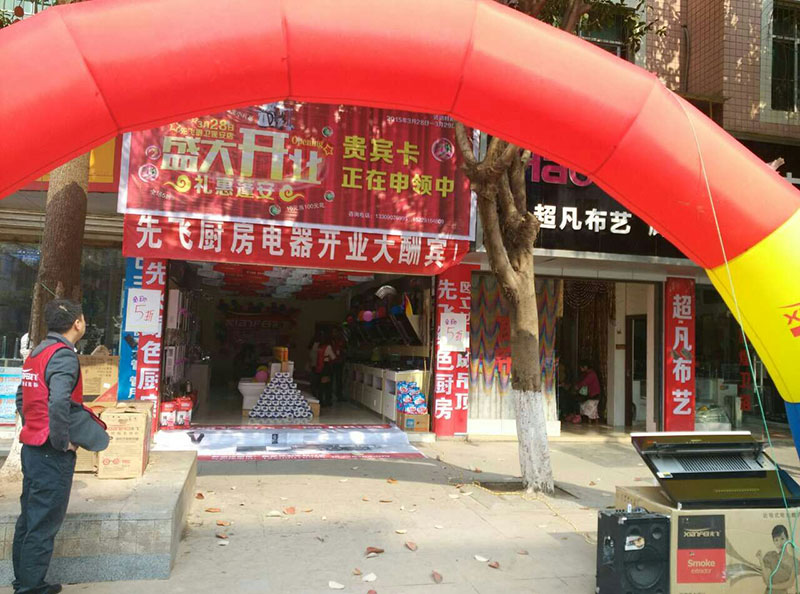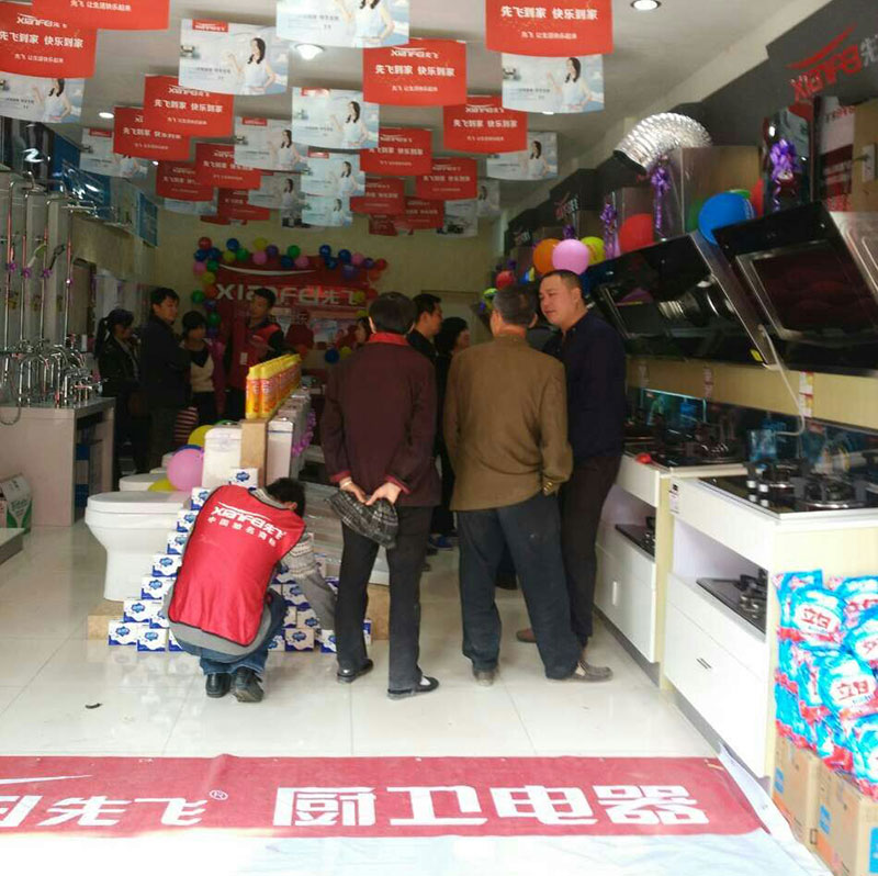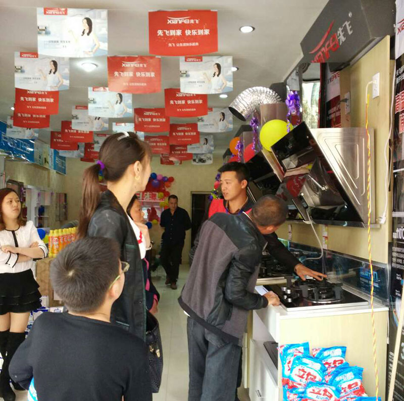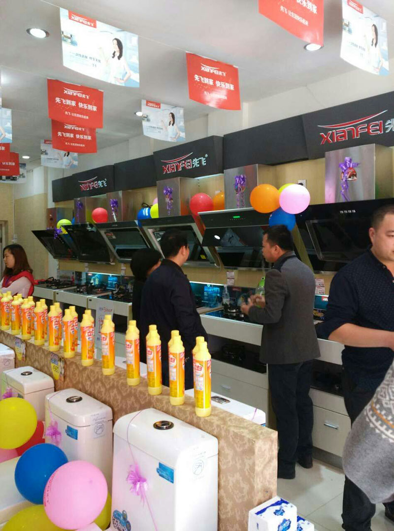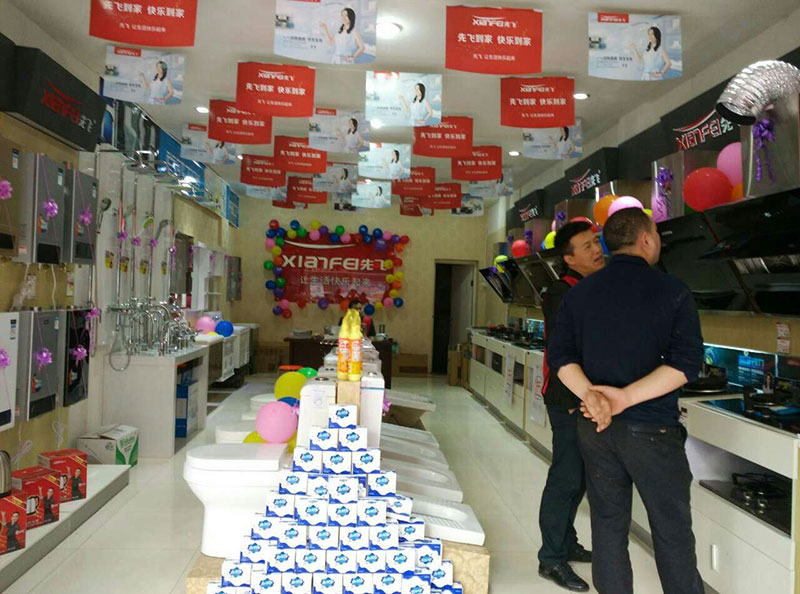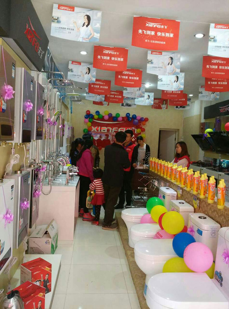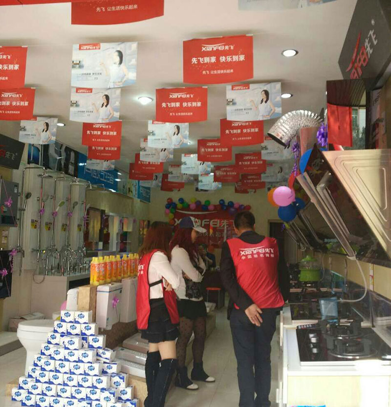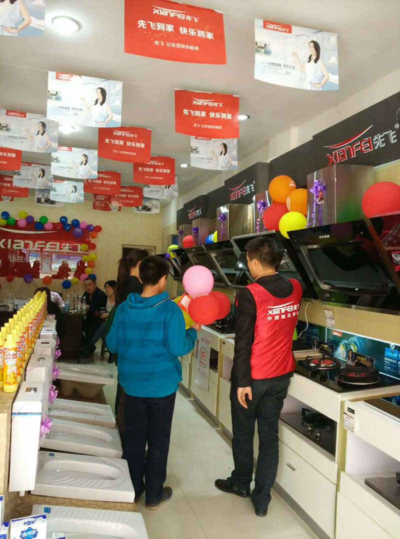 蓬安先飛采用了先飛工廠2015款的標準展架,豐富的煙機,灶具和消毒柜組合,燃氣熱水器組合,全面的展示了先飛系列產品形象。喜慶的汽球,彩帶,先飛吊旗等物料,以及品類繁多的贈品更是錦上添花!
