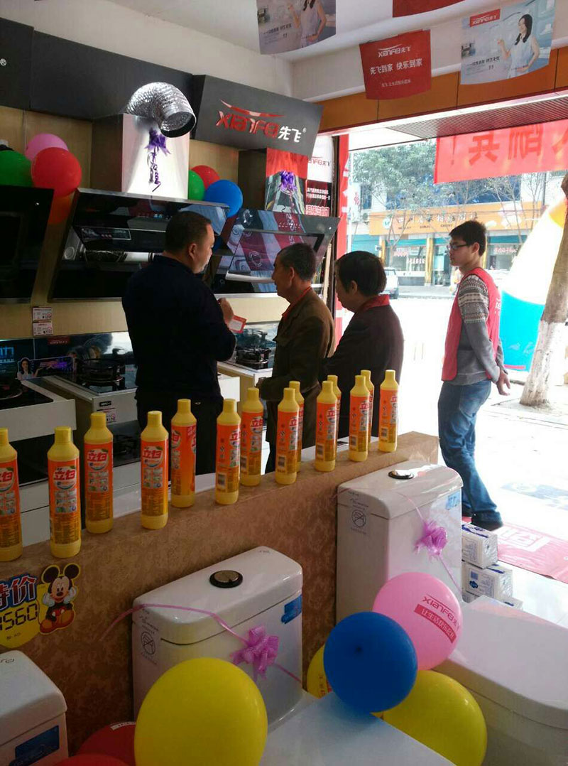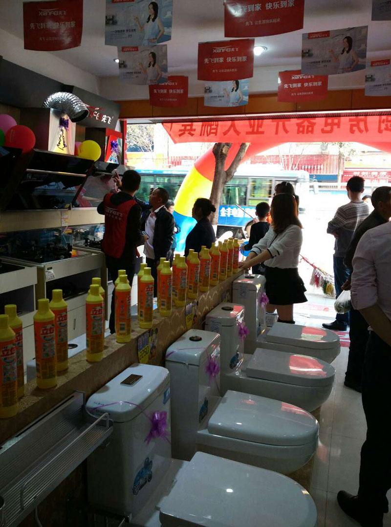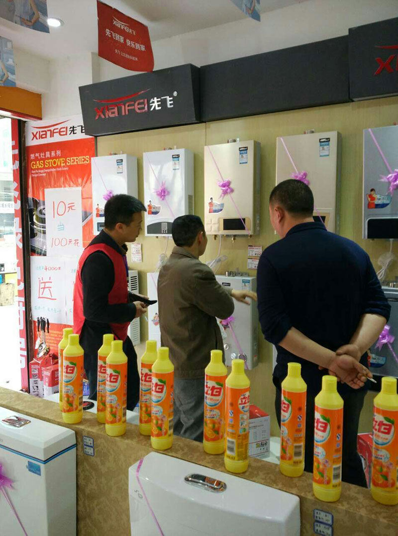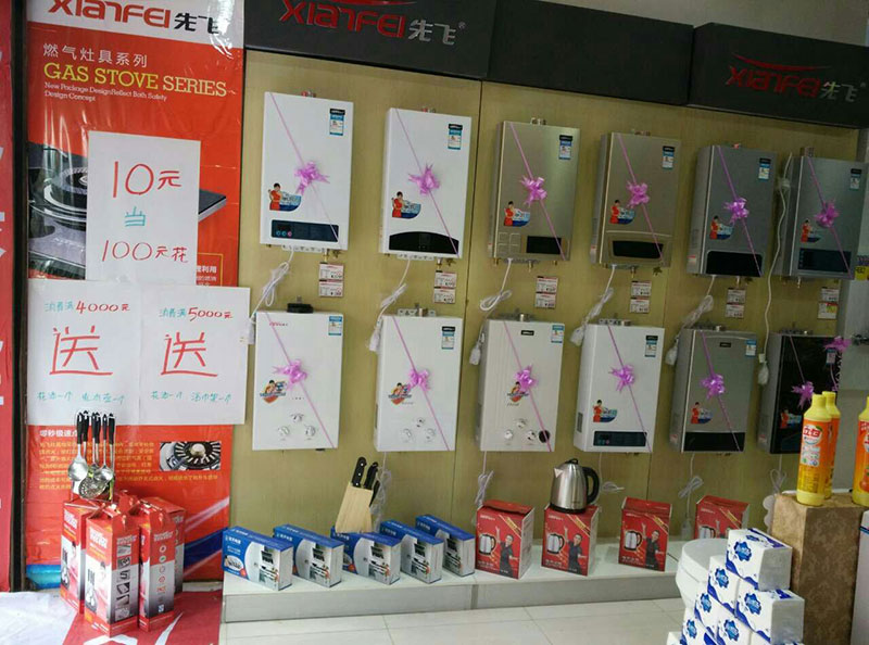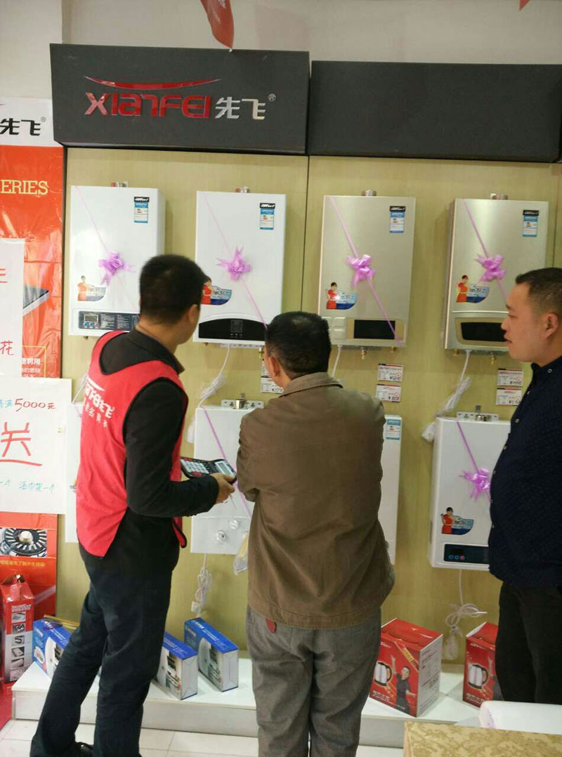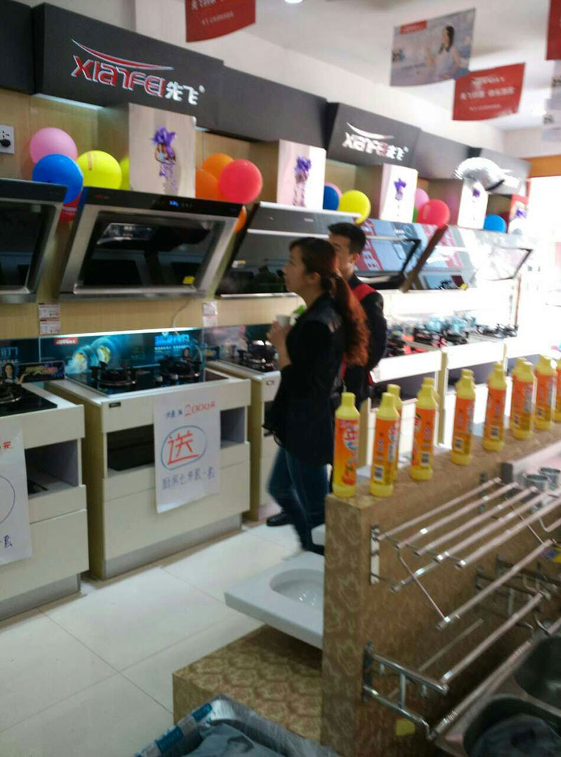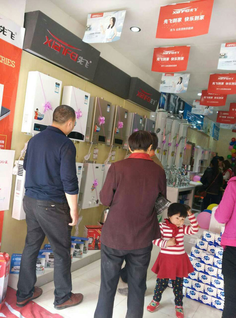 蓬安先飛采用了先飛工廠2015款的標準展架,豐富的煙機,灶具和消毒柜組合,燃氣熱水器組合,全面的展示了先飛系列產品形象。喜慶的汽球,彩帶,先飛吊旗等物料,以及品類繁多的贈品更是錦上添花!