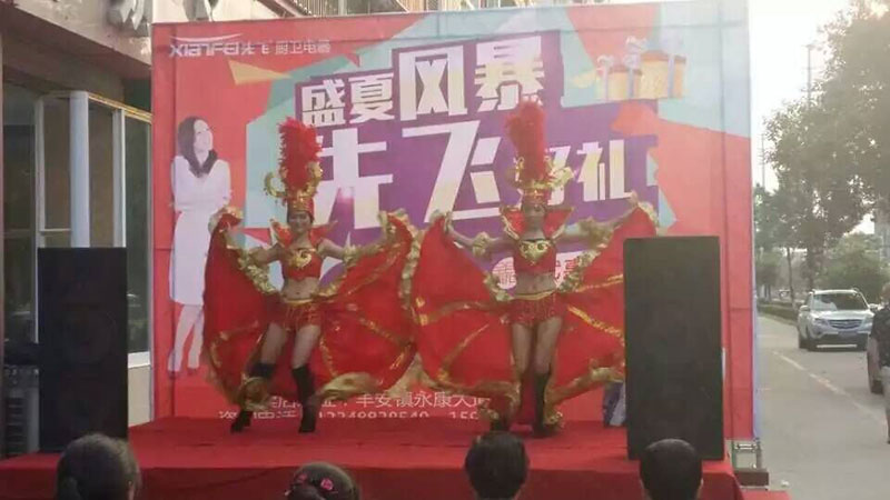 2015年7月11日,先飛電器在羊安部署了強大的促銷陣容,一字排開的活動展架,促銷物料和服裝統一,英姿颯爽的促銷團隊集體亮相,閃亮登場,一場真正的促銷推廣大戲大幕正式拉開。精致的產品,精干的團隊,精美的禮物,精彩的歌舞,帶給客戶的真真切切的實惠,活動吸引了眾多客戶駐足觀看,仔細了解后紛紛下單。
