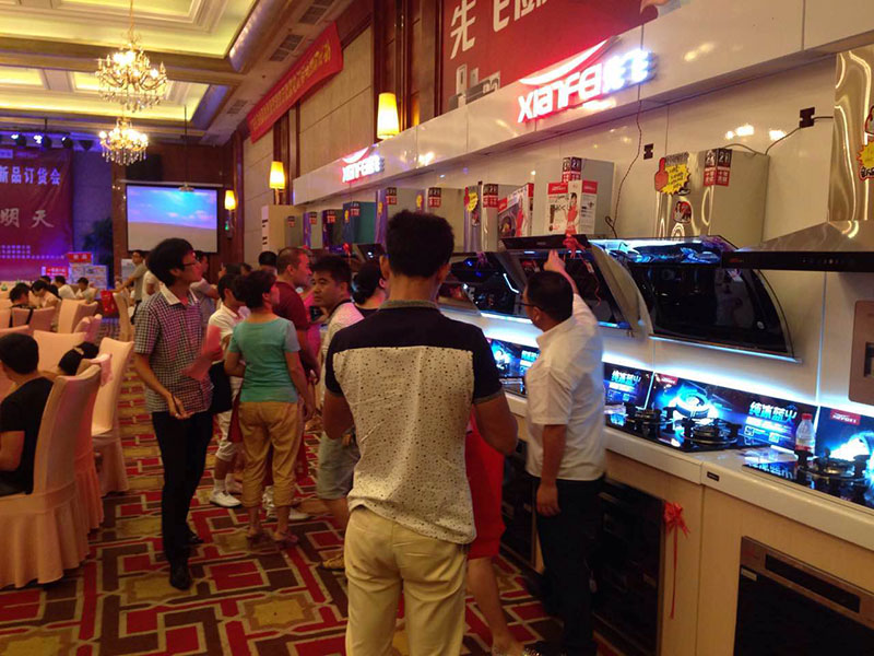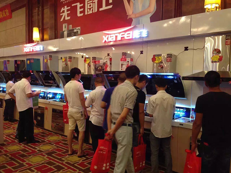 先飛超越版展柜閃亮登陸溫州會場,白色烤漆背板,樹脂透光字燈箱,動人心弦高大上!2015年先飛秋季新品“大吸力煙機”系列、凈水器系列、嵌入式烤箱蒸爐產品全線亮相,引發眾多客戶久久圍觀、選貨與下單吃政策。