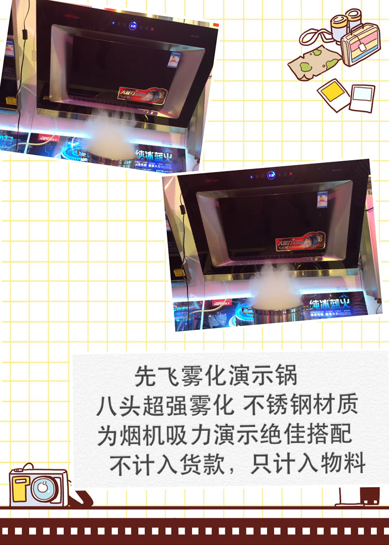 先飛霧化演示鍋,采用八頭超強霧化噴頭,不銹鋼材質,優質變壓器,為先飛“大吸力”煙機、“蒸汽噴洗”煙機、歐式煙機等產品吸力演示絕佳搭配。先飛經銷商朋友們現已可向公司下單訂購,價格可向先飛業務人員咨詢。不計入貨款,只計入物料。