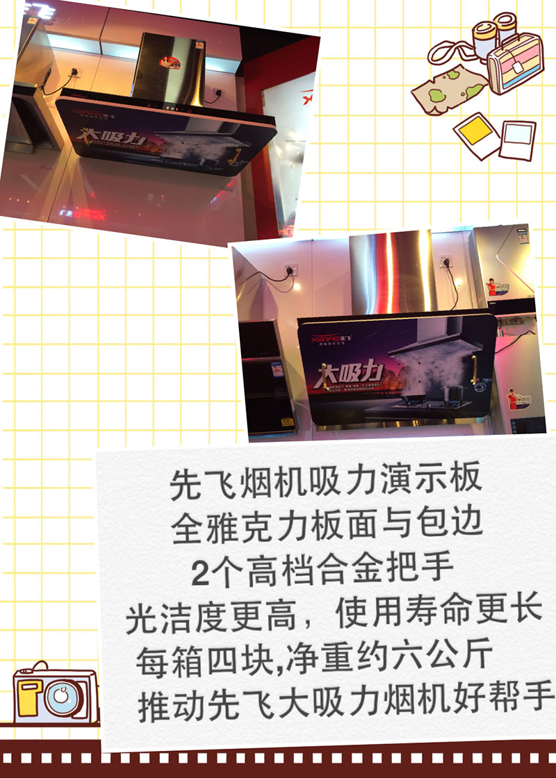 先飛煙機吸力演示板,采用全雅克力板面與包邊,光潔度更高,使用壽命更長;2個高檔合金把手,可另外加掛重物;每箱四塊,每塊凈重約六公斤,是推動先飛煙機銷售的好幫手!先飛經銷商朋友們現已可向公司下單訂購,價格可向先飛業務人員咨詢。不計入貨款,只計入物料。