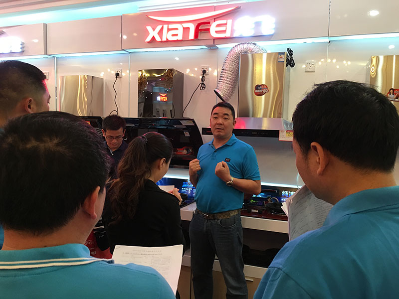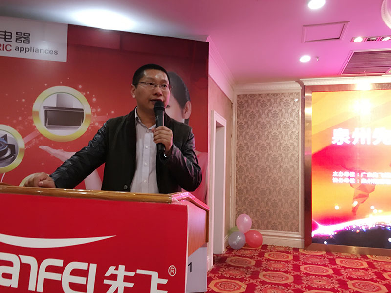 先飛掌門人黃總不僅在會前給泉州先飛業務團隊作了產品講解,而且在會上給大家作了非常詳細的產品指引,贏得大家陣陣掌聲!先飛聶總給大家分享了煙機、灶具等廚衛新品知識,凈水器主管陳磊給大家分享了凈水器產品知識,先飛大區經理林儉富作為會議主持人貫穿全場。