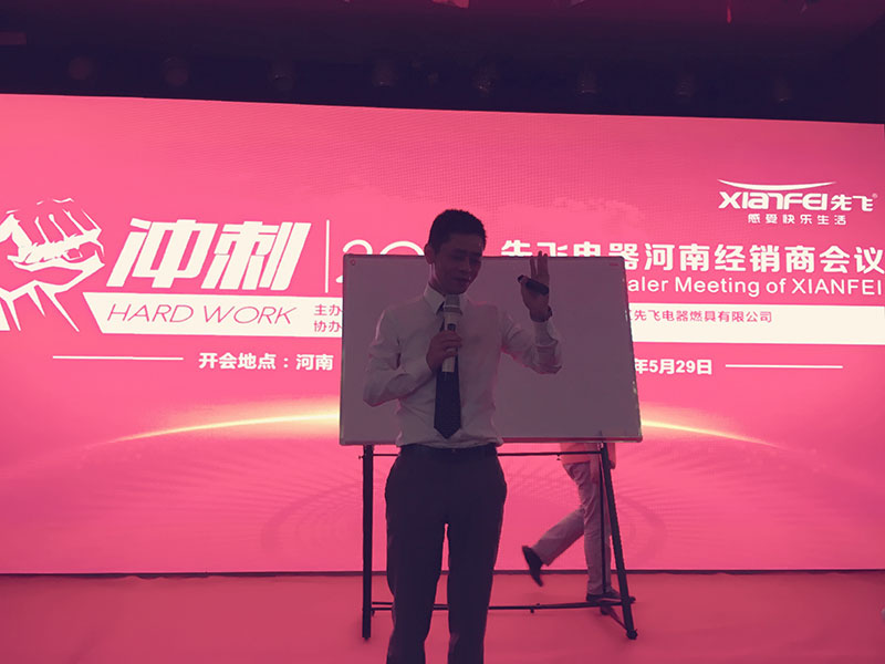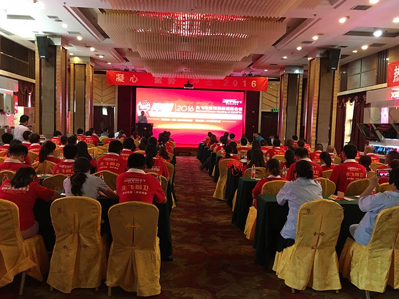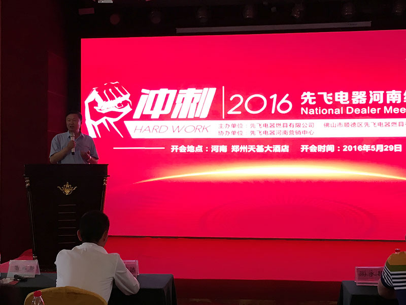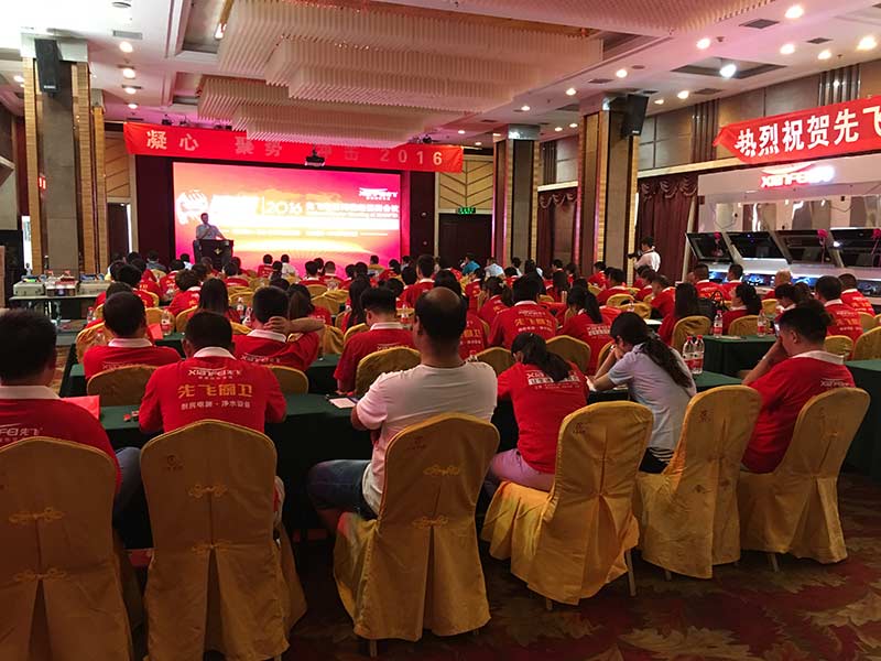 2016年5月29日下午,鄭州市天基中州頤和酒店三樓會議廳正在召開2016年鄭州先飛經銷商會議,120多名河南各地先飛經銷商統一穿著先飛紅色T恤,全場一片火紅,氣氛極為熱烈。