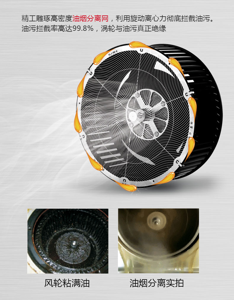 編者按:人人都愛大吸力!但就算是大吸力煙機,在長期工作過程中,渦輪仍然會不斷積油積垢,導致負重不斷增加,吸力不斷下降。先飛煙機 “大吸力+油煙分離”,就是在先飛大吸力煙機的渦輪上增加一張精工雕琢高密度油煙分離網(wǎng),利用旋動離心力主動攔截油污,將接觸到渦輪的油煙徹底凈化成不含油的純煙,從而實現(xiàn)了油污與渦輪真正絕緣,實現(xiàn)先飛大吸力煙機使用三年、五年、八年之久仍然處于吸力巔峰,仍然是大吸力!
