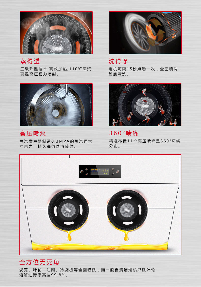 先飛廚衛全國全行業首推煙機“大吸力+”戰略,其中先飛煙機“大吸力+高溫蒸汽洗”就是通過110℃、0.3Mpa的高溫蒸汽強力噴洗煙機渦輪,噴洗8分鐘,甩干3分鐘,從而有效解決煙機吸力衰減等問題。不僅讓新買煙機保持大吸力,而且在使用三年、五年、八年之久仍然處于吸力巔峰,仍然是大吸力,可見先飛煙機“大吸力+”戰略與其他品牌大吸力有著本質不同!