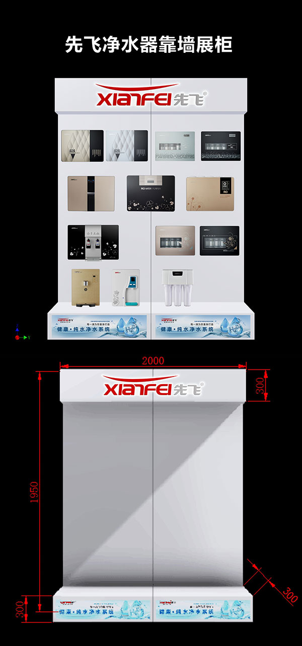 1. 先飛凈水器靠墻展柜(一組一米,靠墻安裝)
