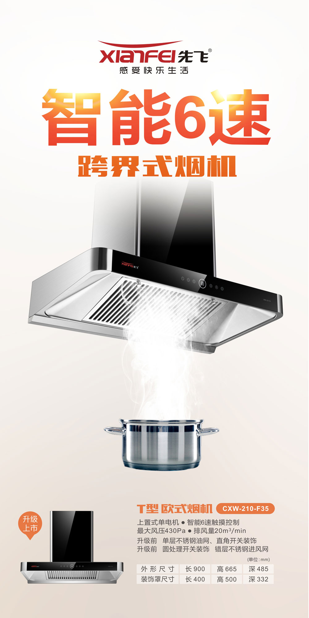 經(jīng)典歐式煙機(jī)上置式單電機(jī),智能6速觸摸開關(guān),最大風(fēng)壓可達(dá)430Pa,排風(fēng)量20m3/min,900長(zhǎng),配置升級(jí)如下: