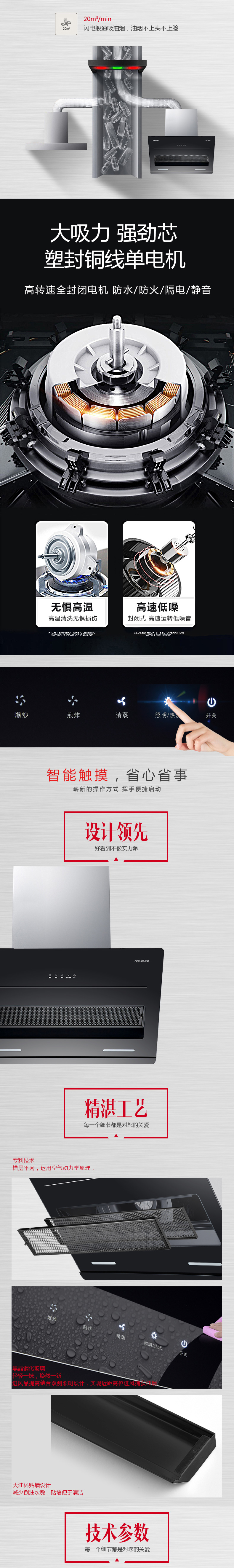 熱炫除油 一鍵自清洗 易拆式油網(wǎng) 超強吸油動力 揮手智控 凈煙零觸 黑晶玻璃 輕輕一抹 煥然一新 大油杯貼墻設計 閃電般速吸油煙 21m3/min